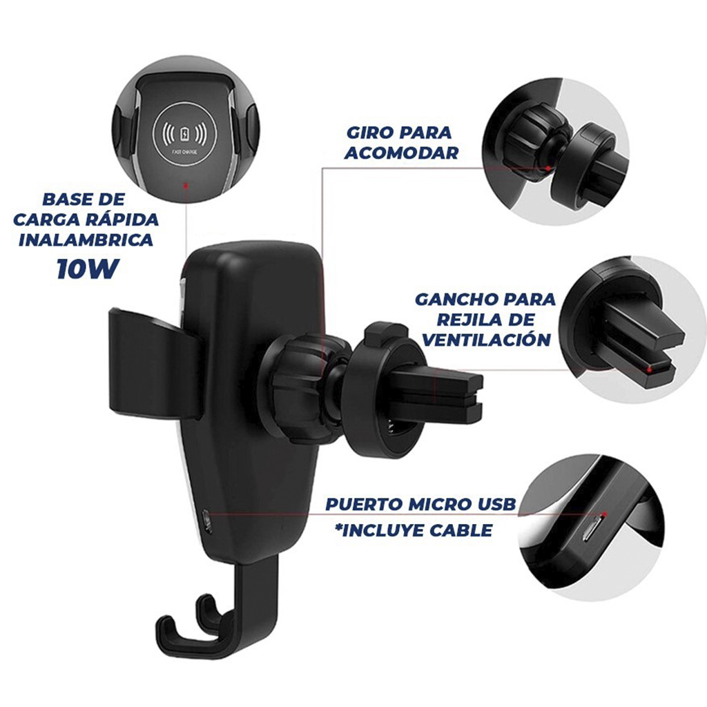 *Incluye cable micro USB (V8), Adaptador para rejilla de ventilación y Adaptador 3M para tablero del auto.